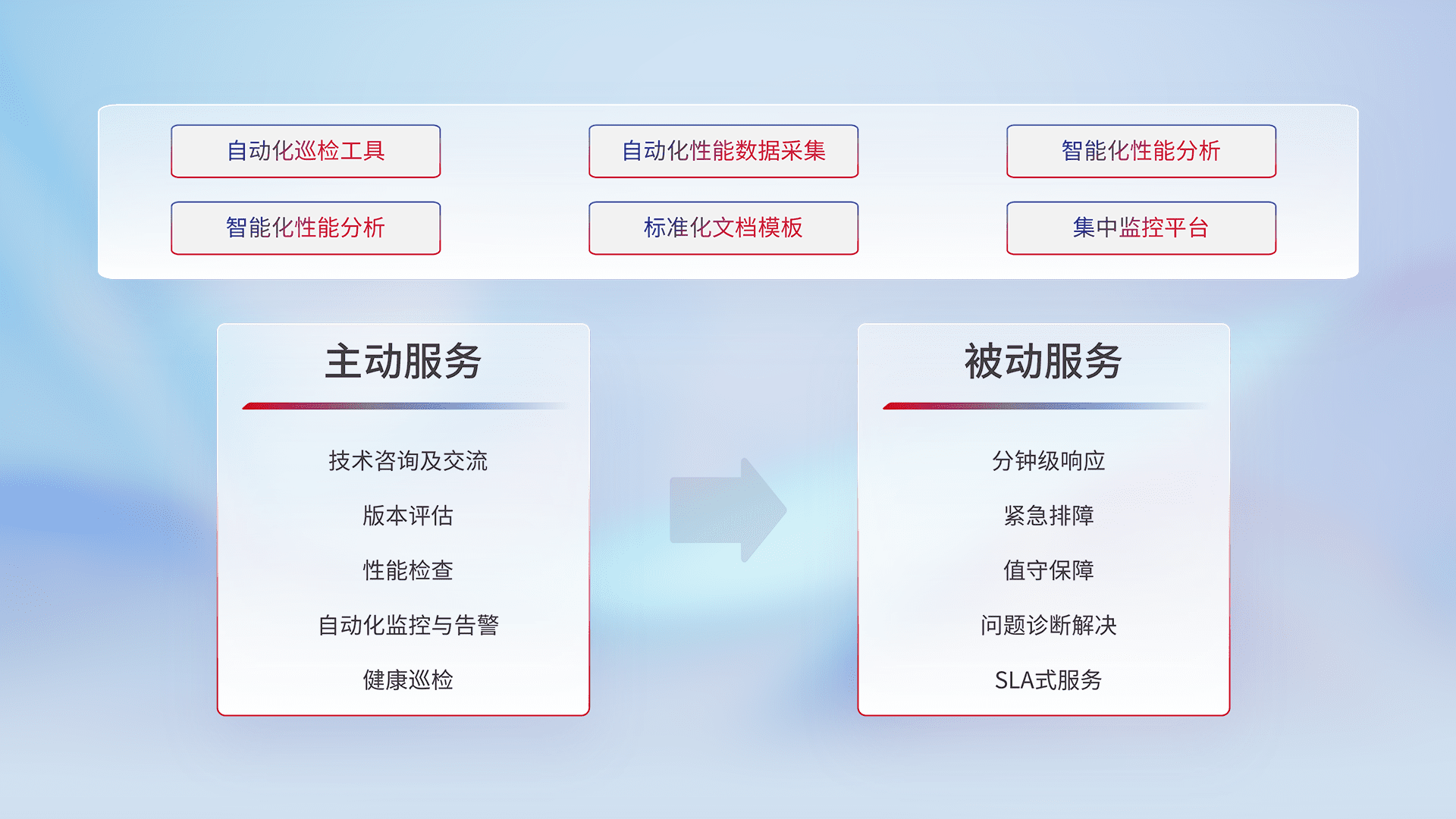 智能化工具和标准化文档,,,,保障服务质量,,提供主动服务(包含技术咨询、、、、版本评估、、性能检查、、、自动化监控与告警、、健康巡检)和被动服务包含(分钟级响应、、紧急排障、、、值守保障、、、、问题诊断解决、、、、SLA服务)。。。